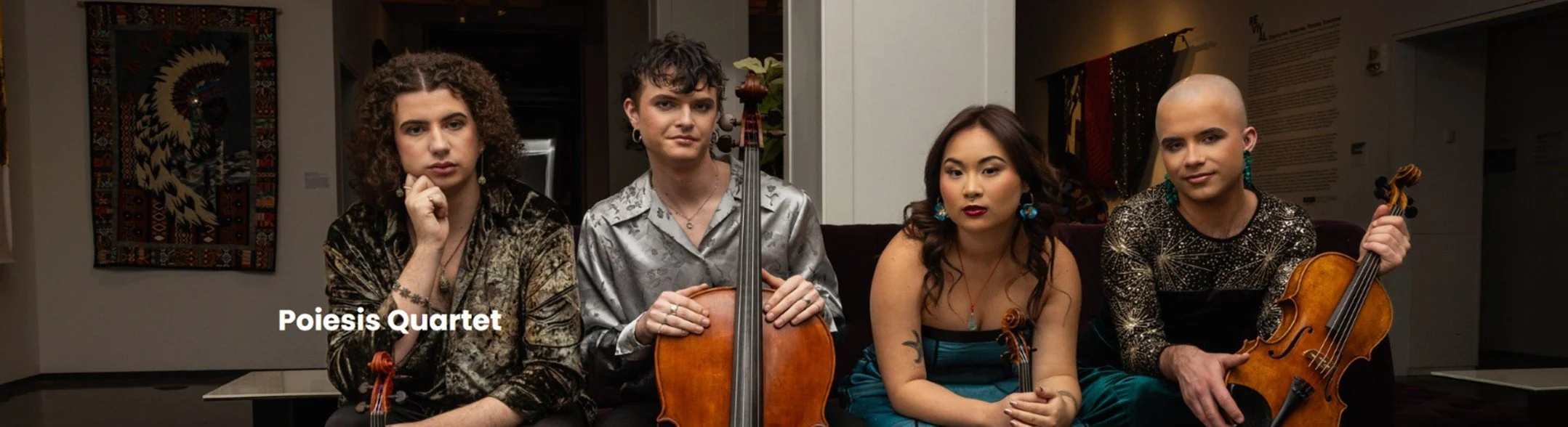 The Poiesis Quartet is the 2023 Grand Prize winner of the Fischoff National Chamber Music Competition. Having formed just eight months earlier during Oberlin Conservatory's Advanced String Quartet Seminar, Poiesis also received Fischoff’s Senior Strings Gold Medal and the Lift Every Voice prizes, as well as the Gold Medal and BIPOC Prize at the 2023 St. Paul String Quartet Competition. In January 2023, the Quartet completed an international tour in Uruguay with artistic residencies in Punta del Diablo and Punta del Este’s premier concert series, Conciertos del Este. Performances included the world premiere of Alejandro Melo’s composition “Elegy” which was dedicated to the Quartet. As part of their Fischoff Gold Medal and Grand prizes, Poiesis embarked on a tour of both the Midwestern U.S. and Emilia Romagna, Italy. In the 2023-24 season, Poiesis made their debuts on series including the Schneider Concerts in New York City, the Kent Blossom Music Festival, and the Faculty Chamber Series at Baldwin Wallace University. Comprised of violinists Sarah Ma (22) and Max Ball (22), cellist Drew Dansby (24), and violist Jasper de Boor (23), members of the Poiesis Quartet have attended programs such as Kneisel Hall, the Perlman Music Program, Verbier Festival Orchestra, Aspen Music Festival, and Madeline Island Chamber Music’s Fellowship program.